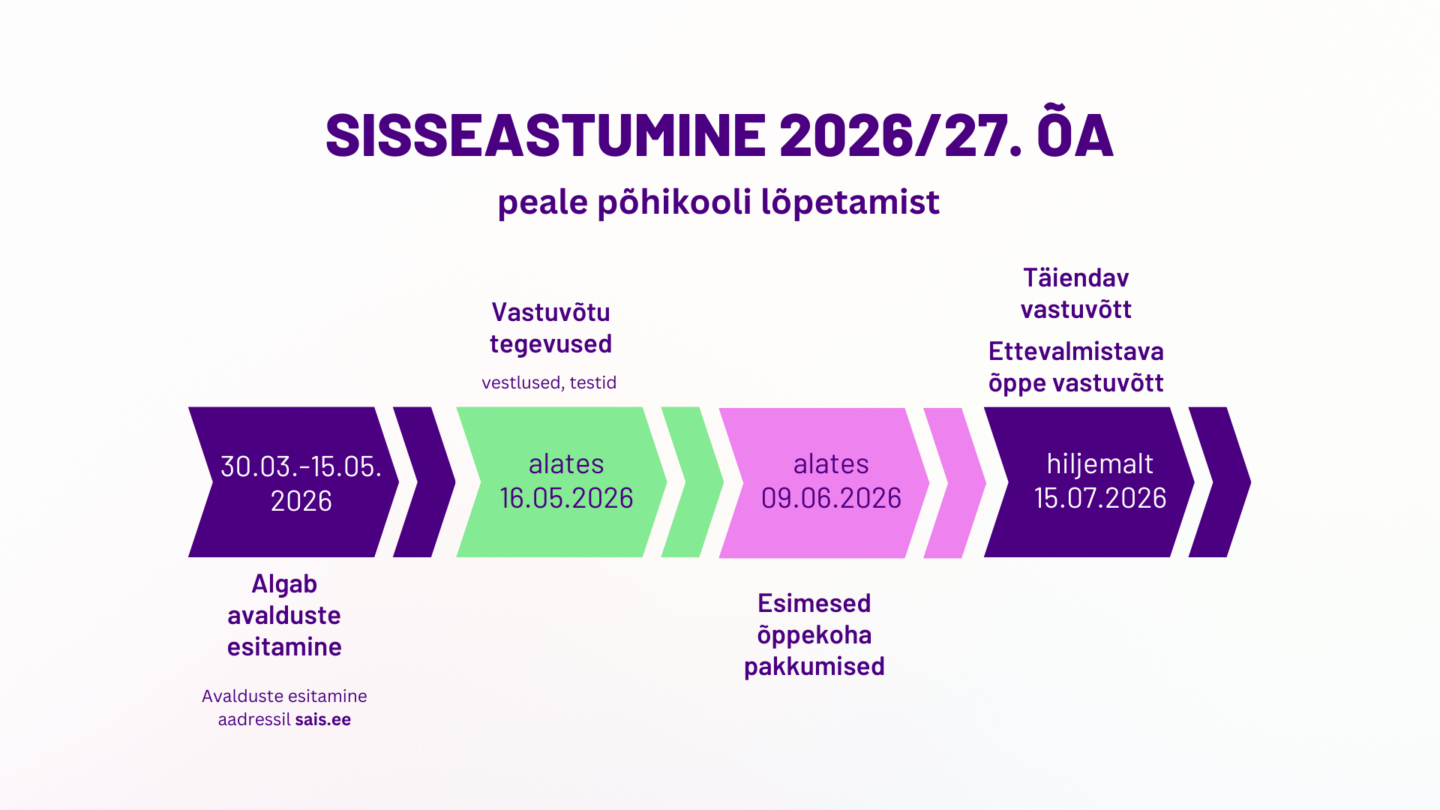 Sisseastumisavalduste esitamine toimub infosüsteemi SAIS kaudu ajavahemikul 30.03.–15.05.2026 aadressil www.sais.ee.